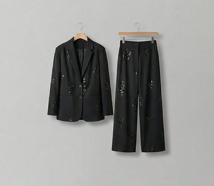 Sequin Blazer & Trousers Set: Tailored glamour with artful sequin details. The structured blazer and minimalist trousers balance dazzle with sophistication—perfect for galas, dinners, or any occasion where you’re meant to shine.